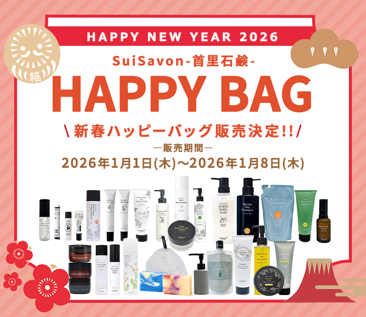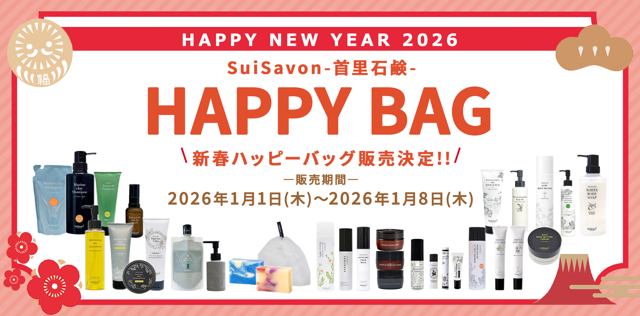 首里石鹸では新しい年を心安らぐ香りと共に迎えていただきたい。との思いから、今年も“新春ハッピーバッグ(福袋)”をご用意いたしました♪ 全6種の“HAPPY”の中からお好みのセットをお選びいただけます。