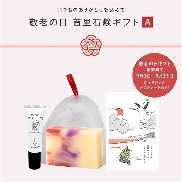 期間中、敬老の日に贈りたい「ギフトセット」をご購入いただけました方に、首里石鹸オリジナル ポストカードをプレゼントさせて頂きます。