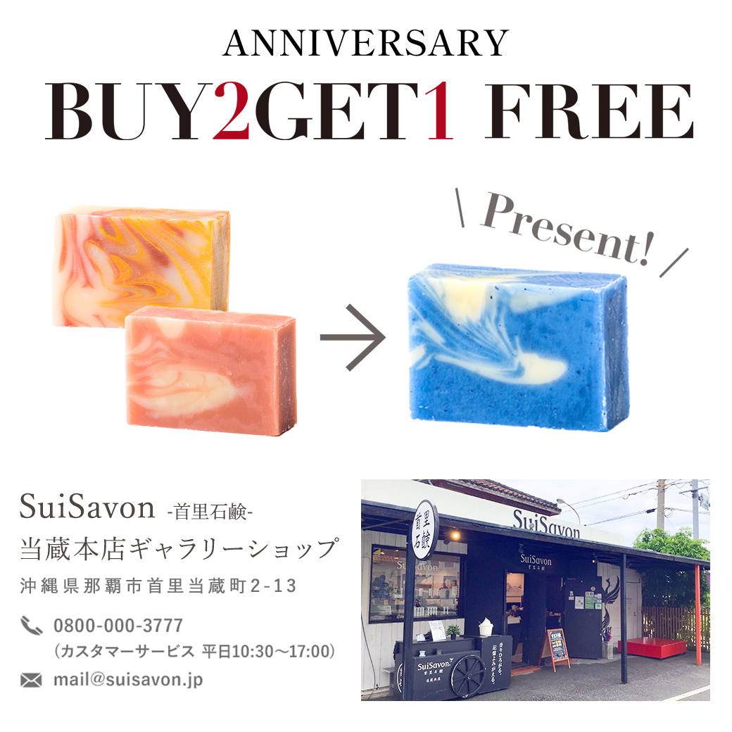 周年祭期間中『当蔵ギャラリーショップ本店』でボタニカルハンドメイド石鹸(120g)を同時に2個買うと、お好きなボタニカルハンドメイド石鹸(120g)をもう1個プレゼント!