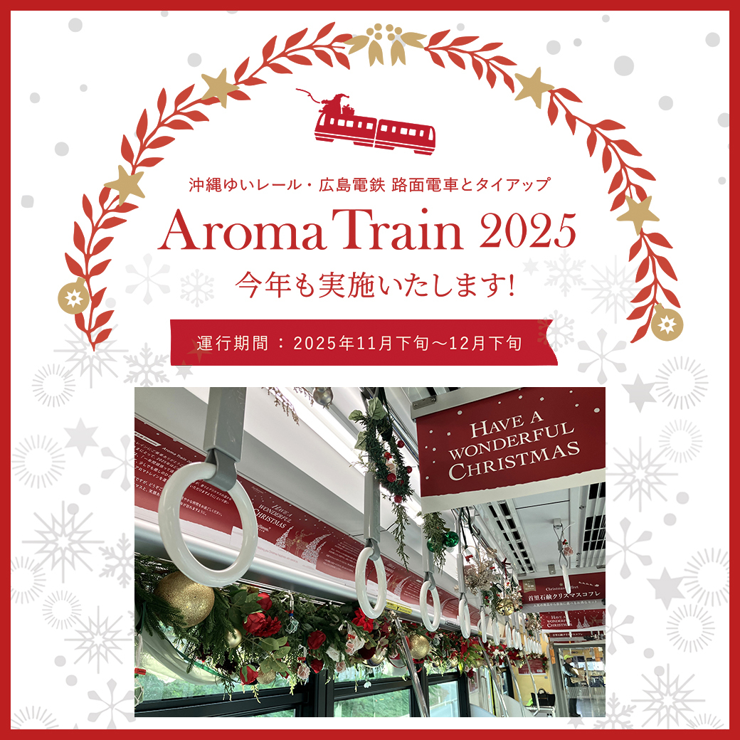 今年のアロマトレインは、新たな演出として、車両内にポインセチアやオーナメントなどクリスマスらしい装飾と共に、首里石鹸のオリジナル製品「ボタニカルハンドメイド洗顔石鹸CUBE」をあしらい、ご乗車いただく皆さまにクリスマスのぬくもりと癒しの香りをお届けいたします。