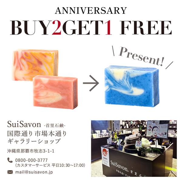 周年祭期間中『市場本通りギャラリーショップ』でボタニカルハンドメイド石鹸(120g)を同時に2個買うと、お好きなボタニカルハンドメイド石鹸(120g)をもう1個プレゼント!