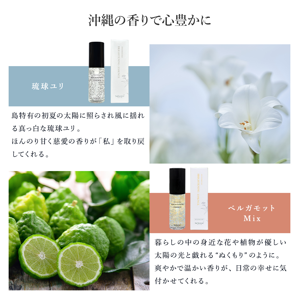 優しくありのままを受け入れてくれる琉球ユリの香りと、日常の幸せに気付かせてくれるベルガモットMixの香り。ふたつの沖縄の香りが日々のスキンケアタイムを彩り、肌だけでなく、心まで整うような気持ちにさせてくれます。
