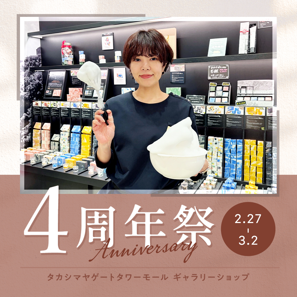 おかげさまで首里石鹸タカシマヤゲートタワーモールギャラリーショップは4周年を迎えることとなりました。