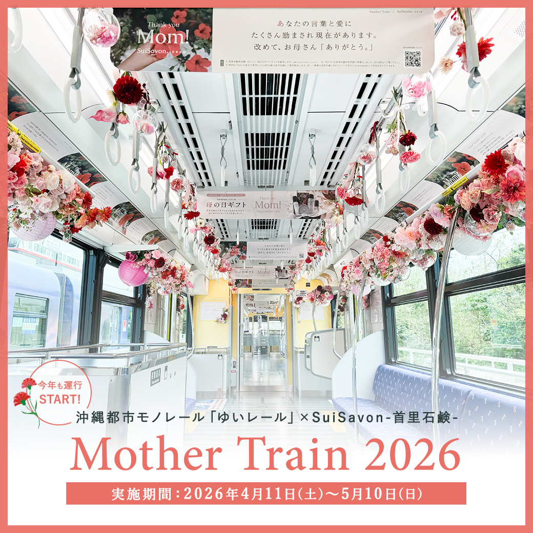 沖縄都市モノレール株式会社とタイアップし、車両内にお花のデコレーションと首里石鹸の「ボタニカルハンドメイドCUBE石鹸」をあしらった「Mother Train 2026」を今年も運行いたします。