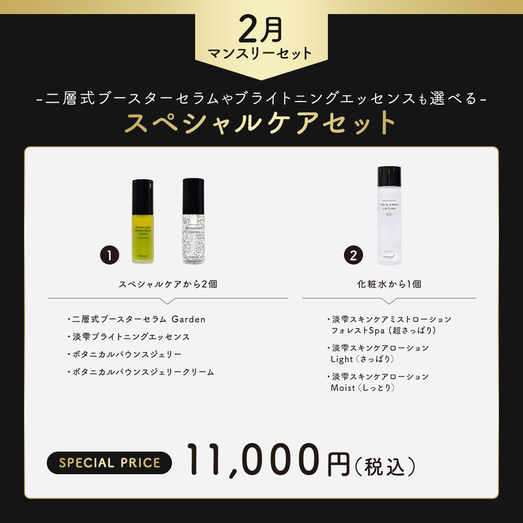 通常の全身保湿ケアに加えて、今の肌状態に合わせてよりディープなケアを重ねたい方に向けた、スペシャルケアセットをご用意しました。 洗顔後すぐに使う二層式ブースターセラム Garden(導入美容液)で、肌をやわらかく整え、スキンケアのなじみを高めるケア。 さらに、淡雫ブライトニングエッセンス(美容液)で、乾燥によるくすみや透明感不足にアプローチするケアなど... 肌のコンディションや季節の揺らぎに合わせて、美容液の組み合わせを選べるのに加え、化粧水も肌タイプに合わせてセレクトしていただけます。 ベーシックな保湿ケアに、美容液を重ねることで、乾燥しやすい2月の肌をより安定した状態へ。 今の肌に必要なうるおいとケアを無理なく取り入れられるスペシャルケアセットで、春を迎える準備を心地よく整えてみませんか。 ※在庫切れとなった製品や香りは、予告なくお選び出来なくなる場合がございます。何卒、ご了承くださいませ。
