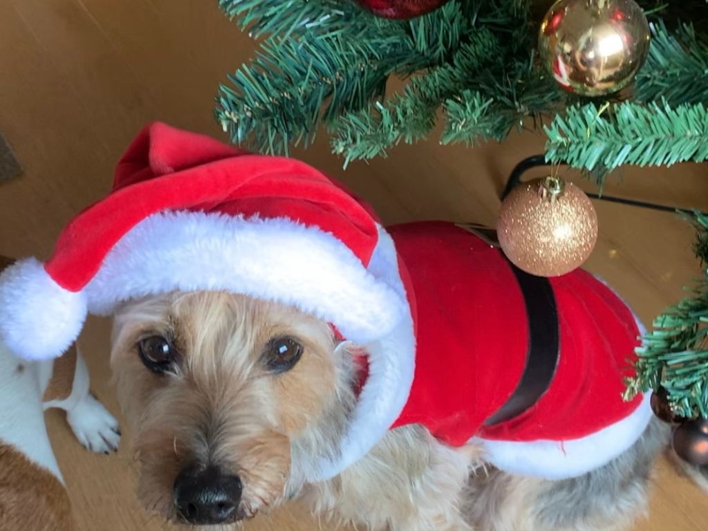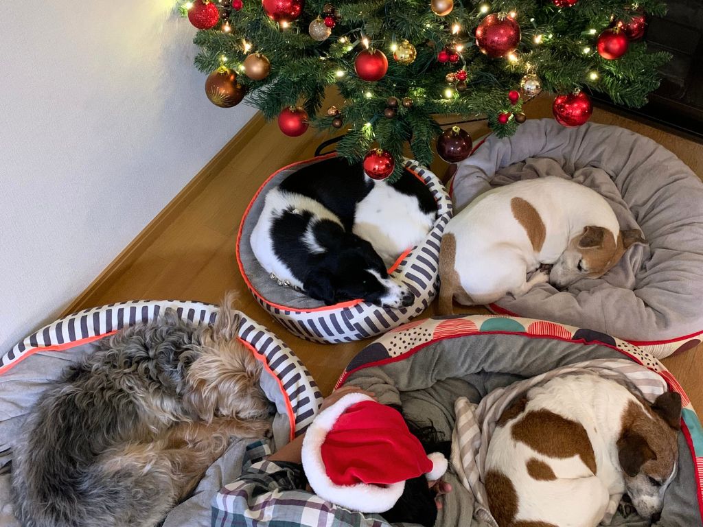 ツリーのそばにちょこんと座る愛犬を見ると、