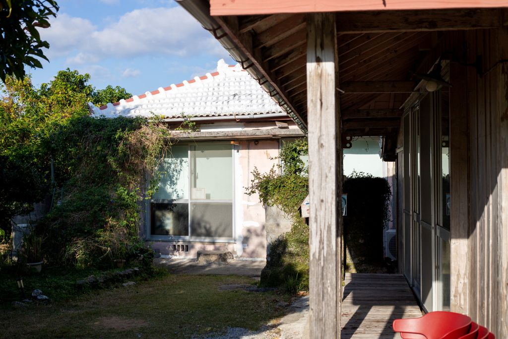 畑体験を楽しんだ後は、白瓦屋根の古民家の縁側でくつろぐ。