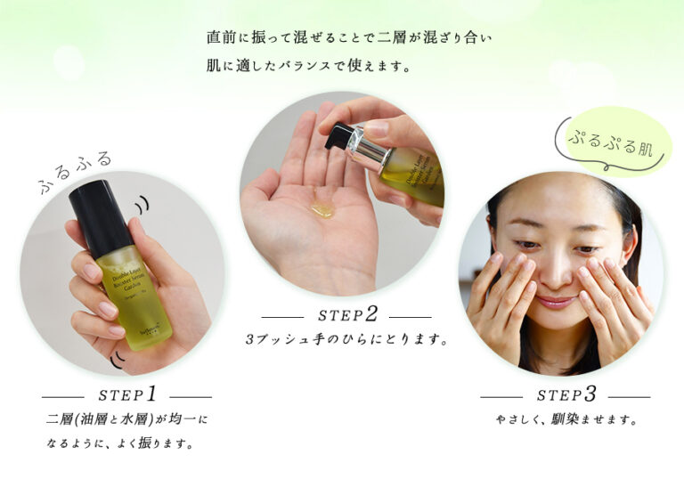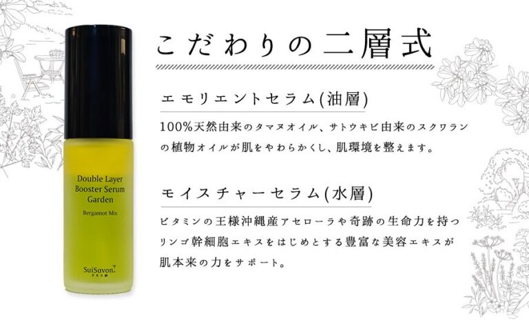洗顔後のファーストステップとしてご使用いただき、水分と油分をバランス良くお肌の内側(角質層)まで届けてくれる【二層式ブースターセラム Garden】。