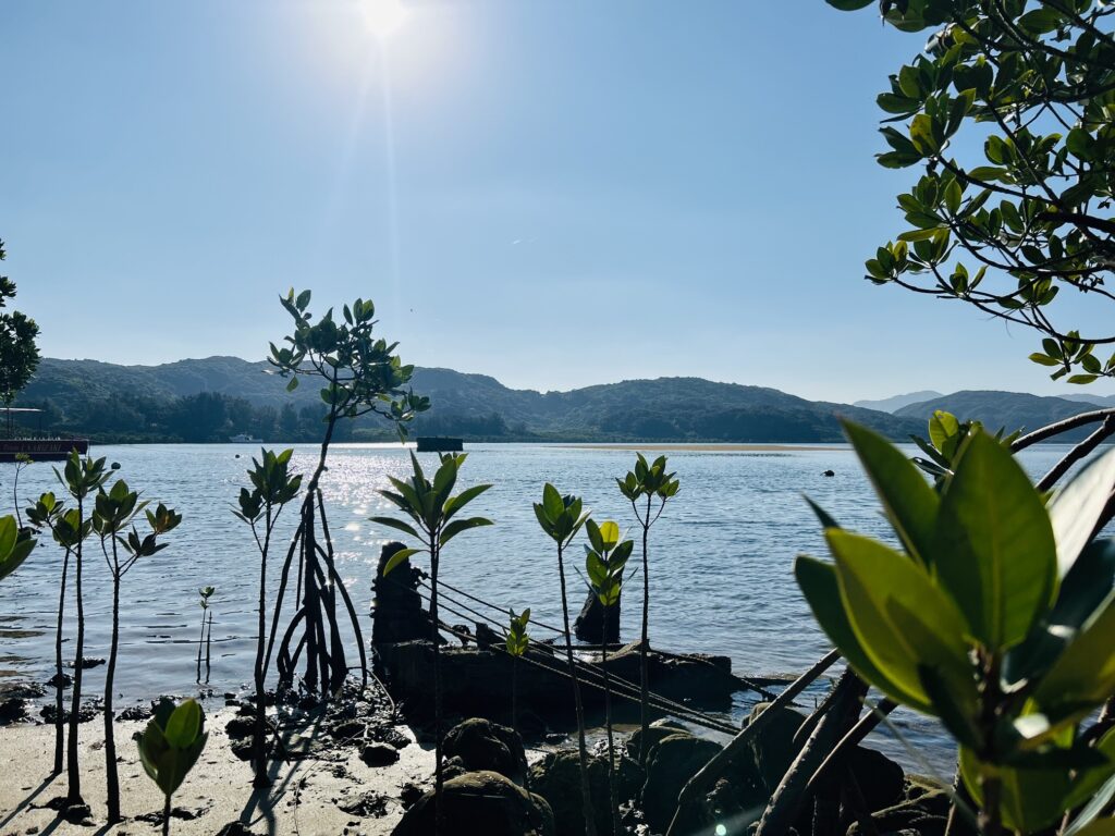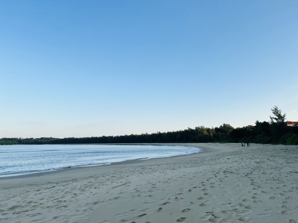 朝焼けが海を照らし、次第に明るくなっていく空と、高くなる朝陽を浴びながら、マングローブが生い茂る川の方へとガイドさんと一緒にビーチサンダルでのんびりと海沿いの浜を歩く。