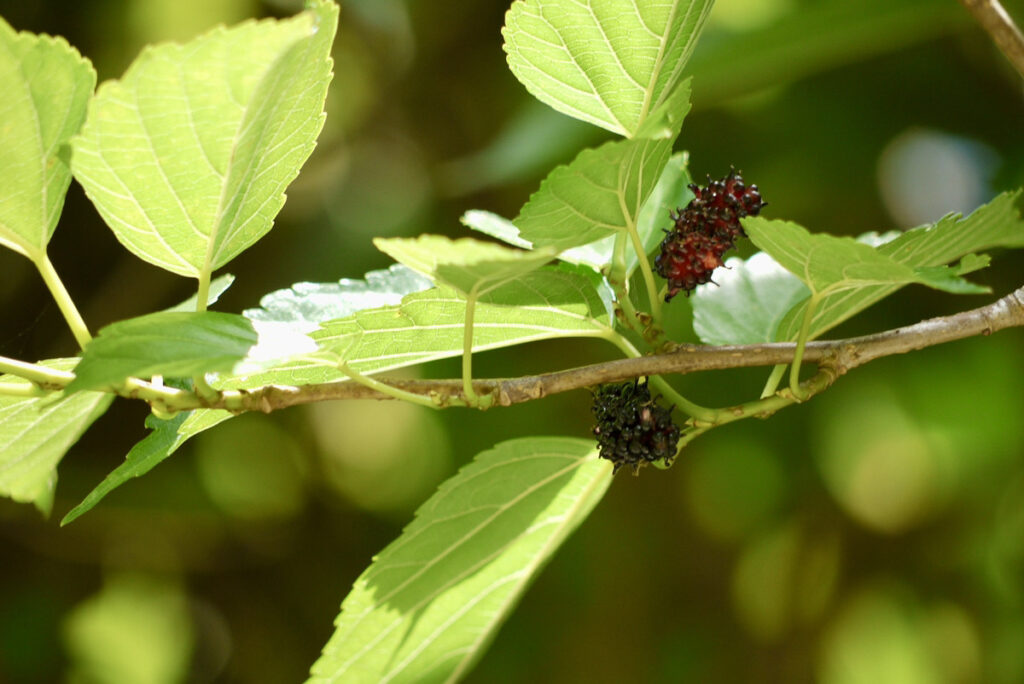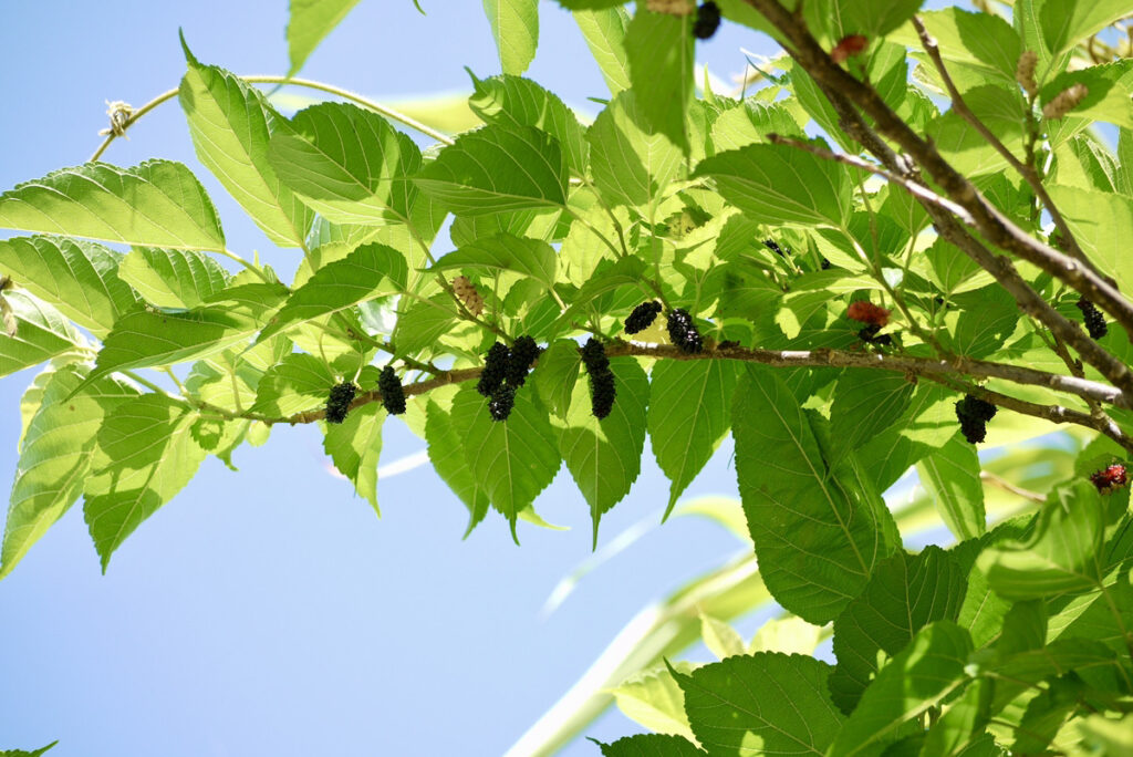 それが、最近実をいっぱいに実らせた桑の木を発見!たわわになるとはこのこと。どれも熟して美味しそうだ。