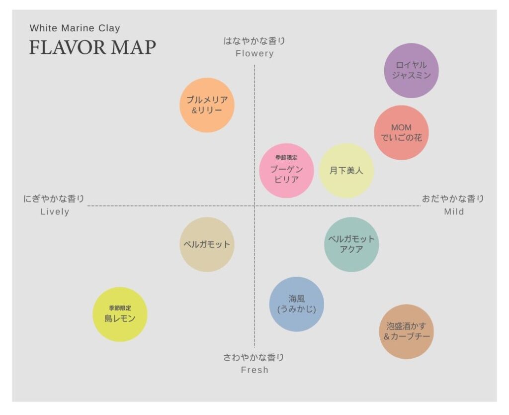 香りは、ときに心を軽くしたり、癒しをくれたりと、日常に寄り添う存在です。「琉球のホワイトマリンクレイ洗顔石鹸」は、香りの展開を豊富にご用意しておりますので、気分に合わせて香りを選んだり、季節ごとの香りを楽しんだりできるのも嬉しいポイント。飽きずに楽しめるところが、魅力ですね♪