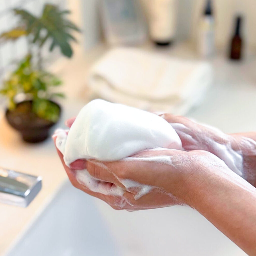 適量(パックの半量程度)を指先にとり、泡立てネットを使いしっかり泡立てます。こすらず泡でなでるように洗い、ぬるま湯でしっかりすすぎます。
