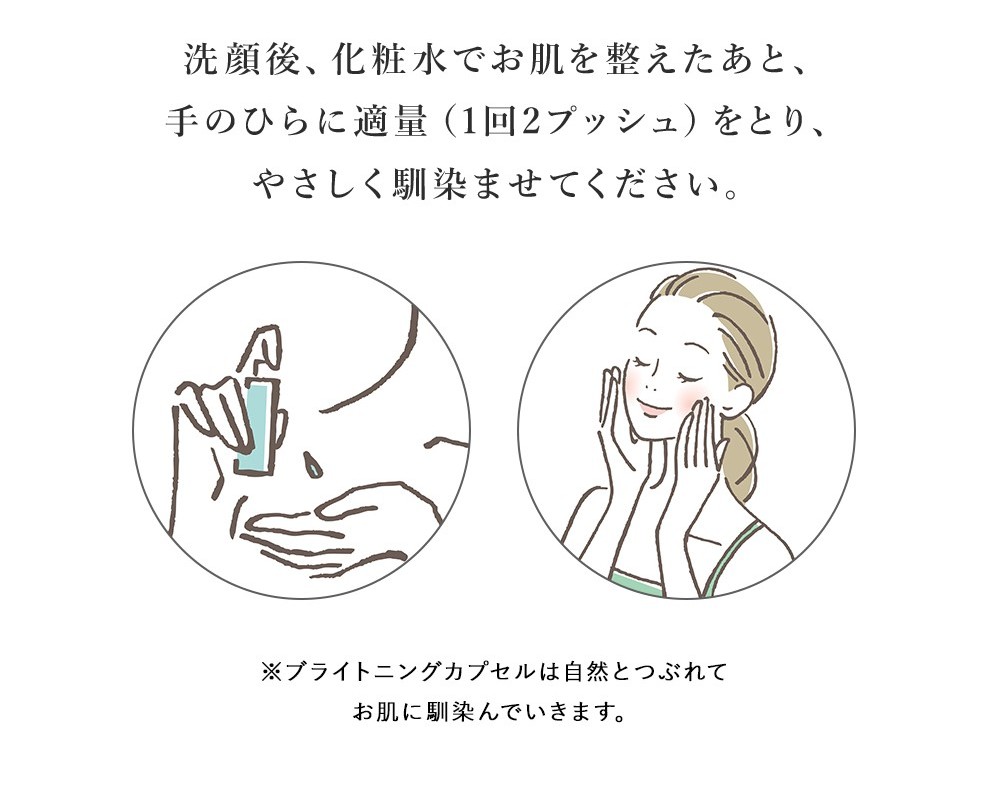 洗顔後、化粧水でお肌を整えたあと、手のひらに適量(1回2プッシュ)をとり、優しくなじませてください。